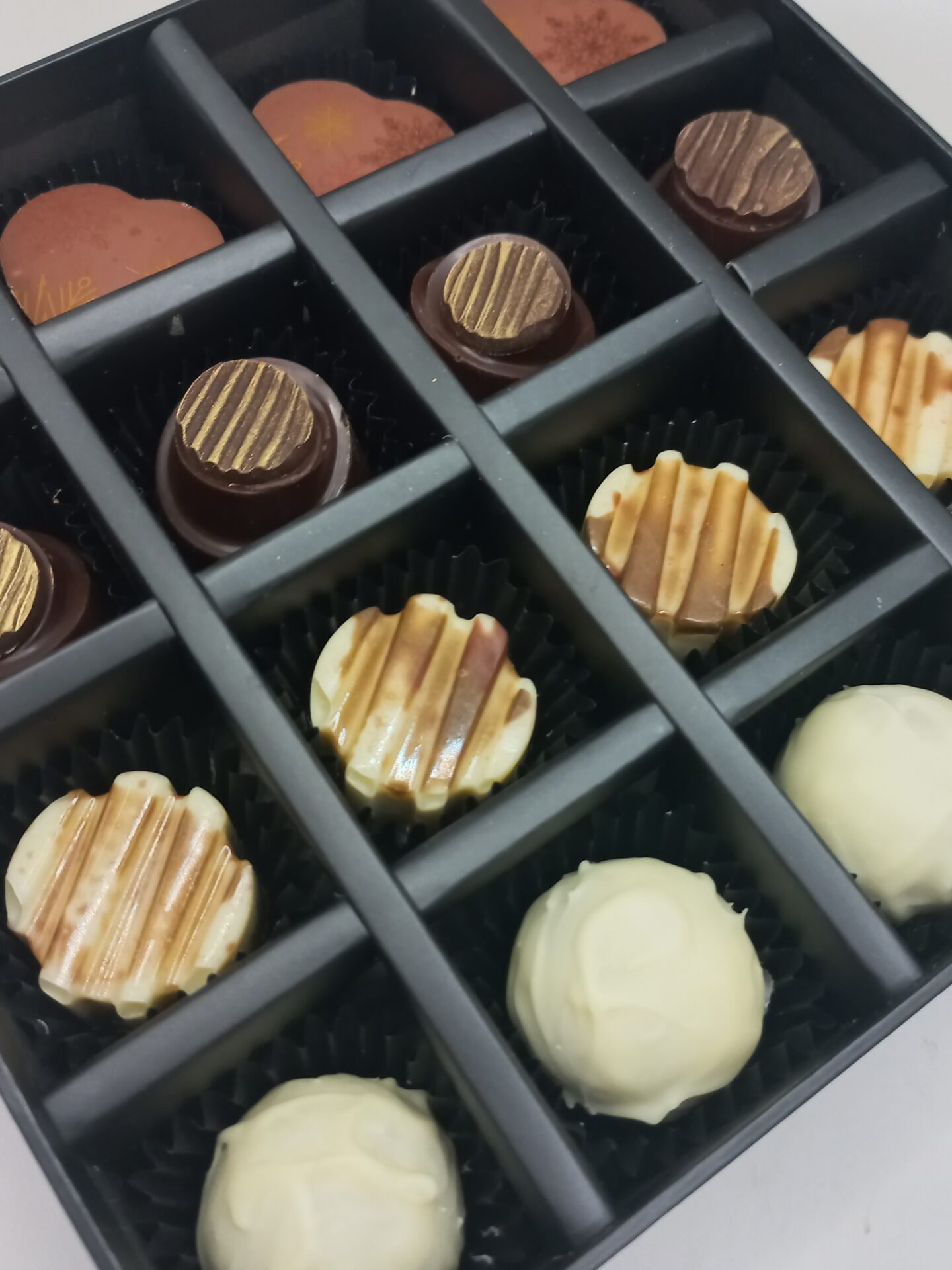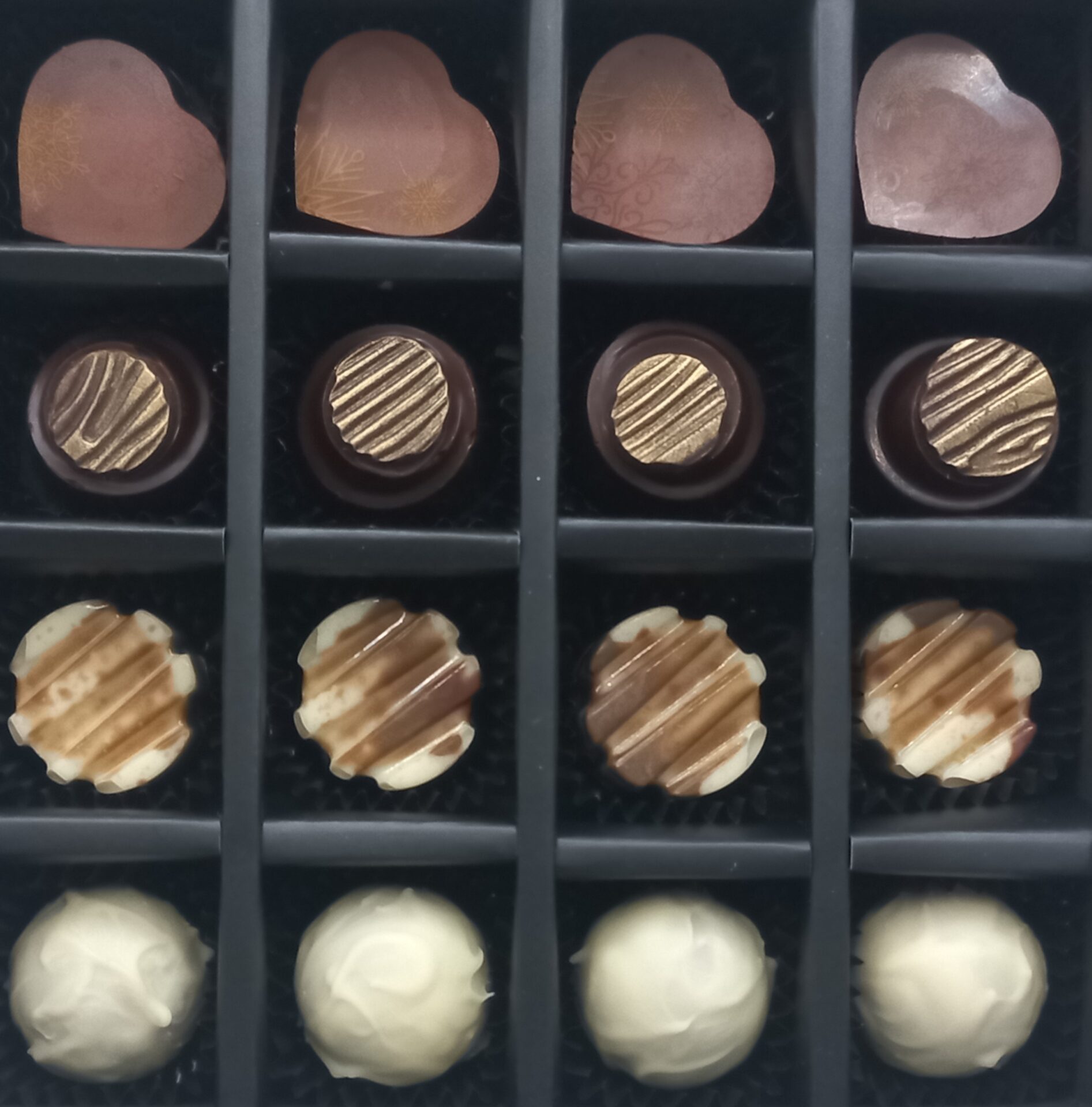 • Kaffee-Karamell: die Optik dieser Praline lässt eine gute Wiener Melange erahnen – ein knackiger Biss in die weiße Schokohülle und schon zeigen sich zwei Füllungen, eine samtige Karamellganache und eine kräftige Kaffeefüllung