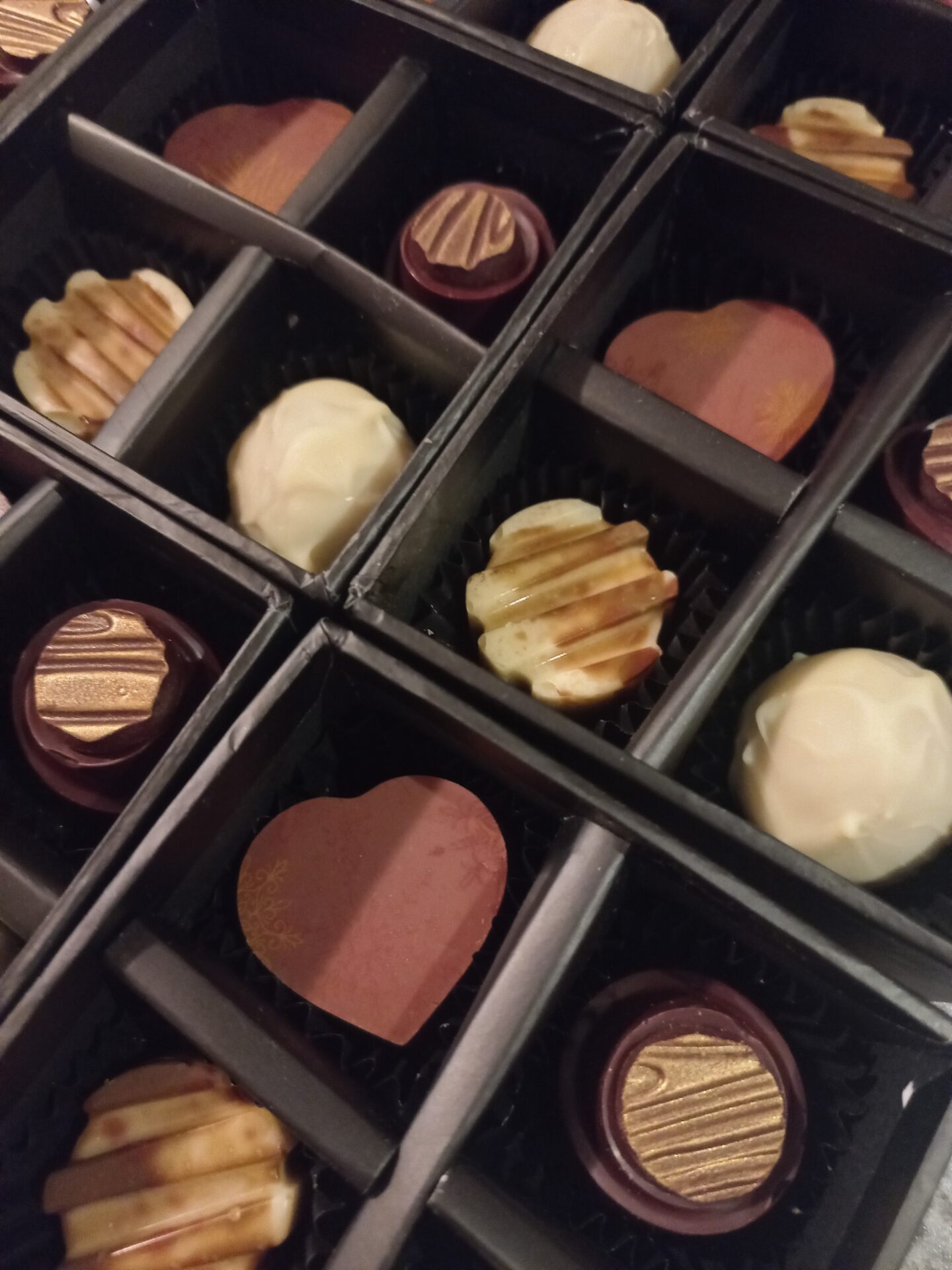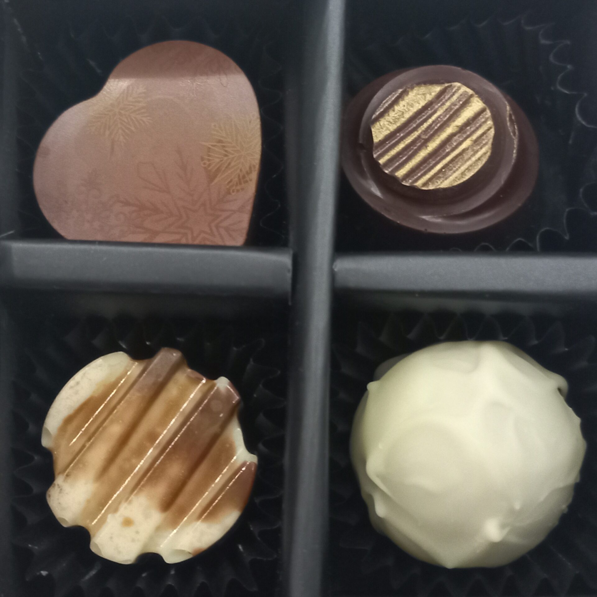 - Kaffee-Karamell: die Optik dieser Praline lässt eine gute Wiener Melange erahnen – ein knackiger Biss in die weiße Schokohülle und schon zeigen sich zwei Füllungen, eine samtige Karamellganache und eine kräftige Kaffeefüllung