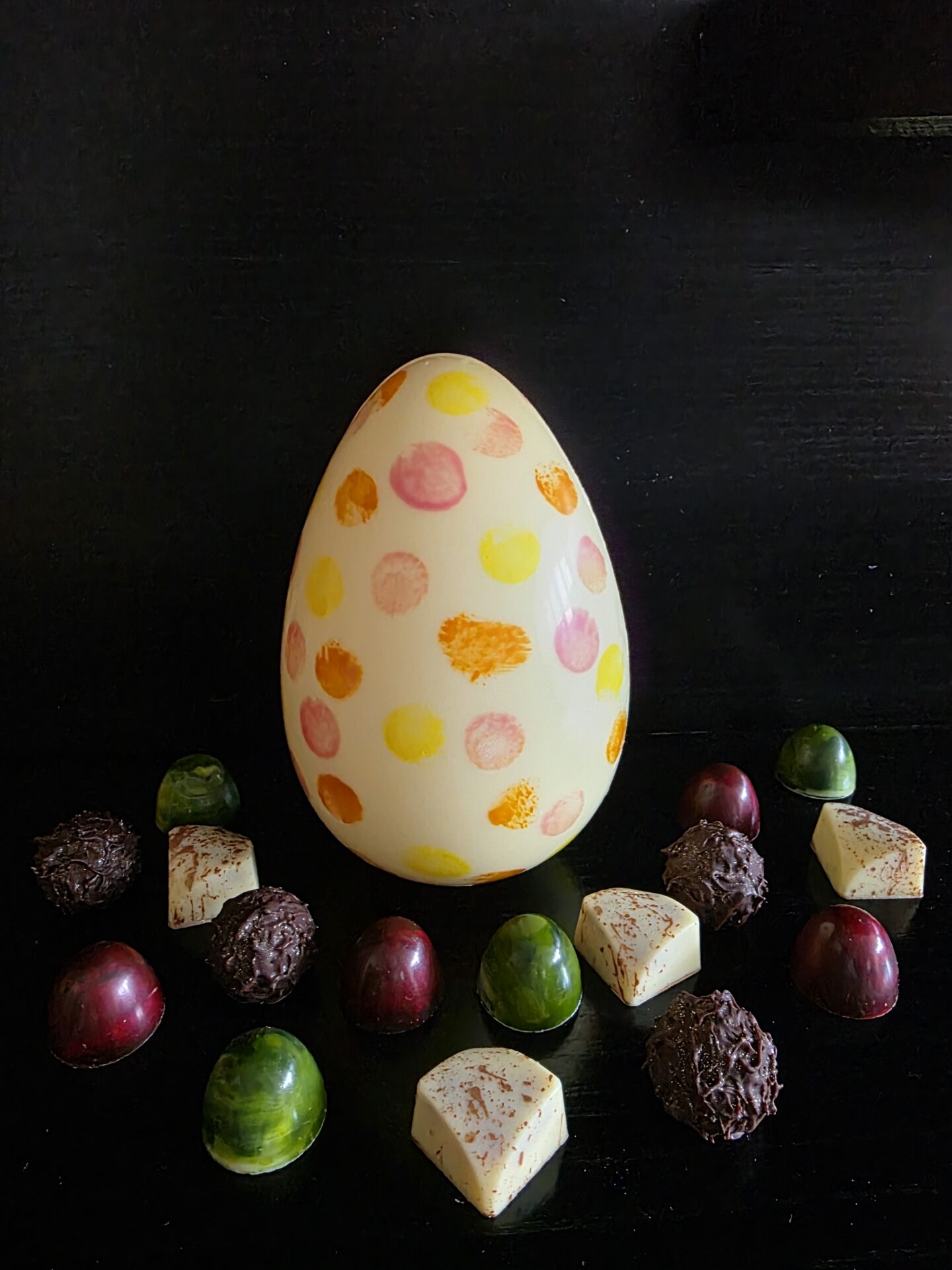 Preis für ein bemaltes Schokoosterei aus weißer Schokolade inklusive 6 Stück Pralinen